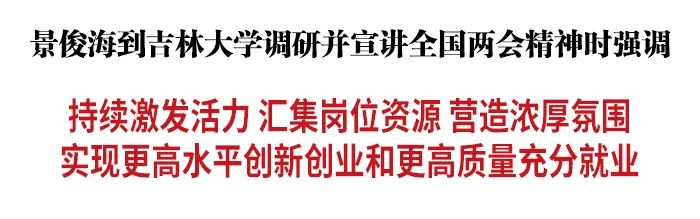 3月24日,省委书记景俊海到吉林大学调研并宣讲全国两会精神。他强调,要深入贯彻习近平总书记在全国两会期间的重要讲话精神,全面落实党的二十大部署要求,聚焦人才强省建设,持续激发活力,汇集岗位资源,营造浓厚氛围,实现高校毕业生更高水平创新创业和更高质量充分就业。