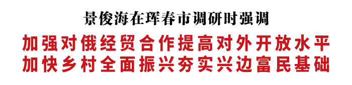 珲春地处中、俄、朝三国交界,是我省对外开放的重要窗口。景俊海深入一线调研,推动对俄经贸合作持续深化。他强调,中俄两国元首3月21日在莫斯科签署关于2030年前中俄经济合作重点方向发展规划的联合声明,为我省推进对俄经贸合作高质量发展提供了重大机遇。全省各级党委政府特别是延边州、珲春市要紧紧抓住中俄两国开展“东北—远东”地区互利合作重大契机,进一步深化与俄地方合作,着力加强互联互通,全面借港出海,大力发展海洋运输、陆海联运、铁海联运,持续提升经济贸易、能源利用、资源加工、海产品分销、农业种养等领域合作水平,为全面推进中俄双边合作贡献吉林力量。