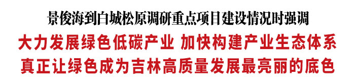 调研中,景俊海强调,白城市、松原市要聚焦全面实施“一主六双”高质量发展战略,围绕“六新产业”发展和“四新设施”建设布局重大项目,着力构建面向未来的现代化产业体系,全面提高经济绿色化程度。要主动融入全省新型能源体系建设,积极参与“陆上风光三峡”、“氢动吉林”行动等重大工程,加快发展方式绿色转型,有序减碳、安全减碳,助力实现“双碳”目标。要坚持保护生态和发展生态旅游相得益彰,扎实推进生态产业化和产业生态化,更好地将高端生态变成高端产业、特色资源变成特色产品、生态优势变成发展优势。