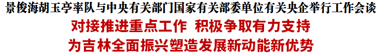 景俊海、胡玉亭衷心感谢中央有关部门、国家有关部委单位、有关央企对吉林振兴发展的关心支持。景俊海、胡玉亭表示,习近平总书记对吉林振兴发展寄予厚望,亲自为吉林擘画蓝图、指引方向,赋予我们“新担当、新突破、新作为”重大责任使命。我们始终牢记习近平总书记殷殷嘱托,深入贯彻新发展理念,全面实施“一主六双”高质量发展战略,大力发展“六新产业”、加快建设“四新设施”,持续深化“五个合作”,扎实推进“百千万”产业培育和“十百千万”企业培育工程,着力推动转型数字化、服务智能化、社会共享化、产业高级化,保持经济社会平稳健康发展。推动吉林全面振兴取得新突破,既需要我们踔厉奋发、主动作为,更离不开中央有关部门、国家有关部委单位、有关央企等各方面的大力支持,希望一如既往关心关注吉林,在完善重大生产力布局、推进高水平对外开放、促进金融服务实体经济、加快重大铁路项目建设、做强做大精细化工产业集群等方面给予更多指导和支持。我们一定为有关工作开展创造良好条件、提供有力保障,确保各项任务落地落实、见到实效。