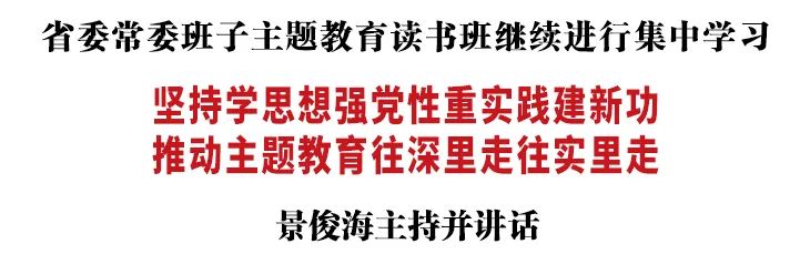 景俊海强调,持续抓好主题教育,是一件事关全局的大事。各级党委(党组)要严格按照党中央要求,精心组织学习活动,扎实推进主题教育,确保圆满完成各项任务。广大党员干部要全神贯注投入学习实践,不断提高推动高质量发展本领、服务群众本领、防范化解风险本领,加强斗争精神和斗争本领养成,提振锐意进取、担当有为的精气神,以满腔热忱奋进新征程、建功新时代。要坚持静下心来、认真钻研,读原文、学原著、悟原理,深刻领悟“两个确立”的决定性意义,增强“四个意识”、坚定“四个自信”、做到“两个维护”,真正用习近平新时代中国特色社会主义思想凝心铸魂。要坚持系统思考、深入交流,深刻把握习近平新时代中国特色社会主义思想的世界观、方法论,坚持好、运用好贯穿其中的立场观点方法,坚决做到入脑入心、见于行动。要坚持丰富载体、创新形式,让广大党员干部接受严肃深刻的党性教育、党史教育、廉政警示教育,进一步筑牢信仰之基、补足精神之钙、把稳思想之舵。要坚持知行合一、联系实际,把主题教育焕发出的激情转化为攻坚克难、真抓实干的强大动力,用各项工作实际成果检验主题教育扎实成效。