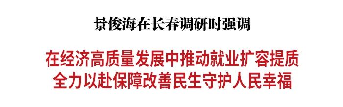 5月24日,省委书记景俊海在长春调研,认真落实学习贯彻习近平新时代中国特色社会主义思想主题教育要求,进一步贯彻党中央关于大兴调查研究的决策部署,深入基层了解稳就业工作情况,研究解决群众关心的实际问题。景俊海强调,要全面贯彻习近平总书记关于就业工作的重要论述,大力实施就业优先战略,多措并举保主体、稳岗位、促增收,在经济高质量发展中推动就业扩容提质,全力以赴保障改善民生、守护人民幸福。