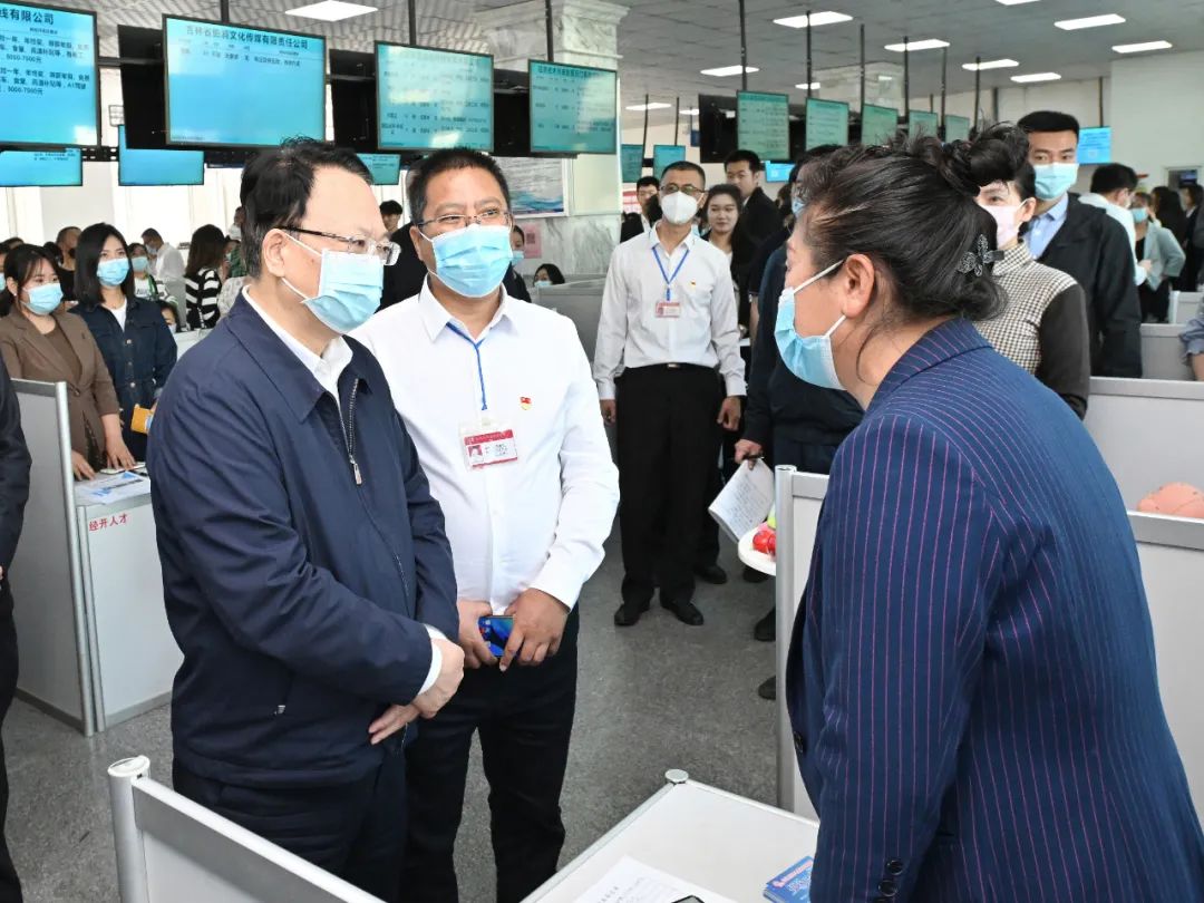 5月24日,省委书记景俊海到长春调研,在经开区人力资源市场详细了解用人单位就业招聘情况。