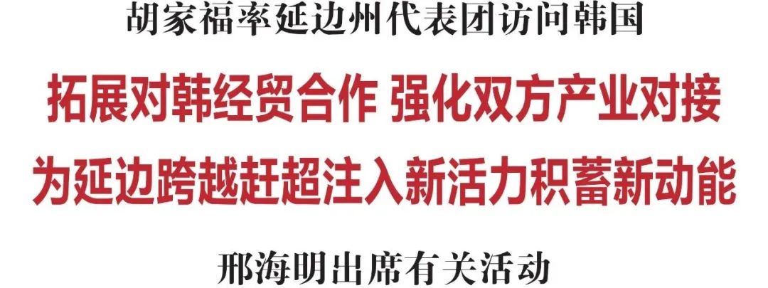 5月29日至6月2日,省委常委、州委书记胡家福率领延边州代表团访问韩国,深化友好交流交往,拓展对韩经贸合作,强化双方产业对接,携手实现互利共赢,为延边跨越赶超注入新活力、积蓄新动能。中国驻韩国大使邢海明,中国驻韩国大使馆经济商务公参谷金生出席有关活动。