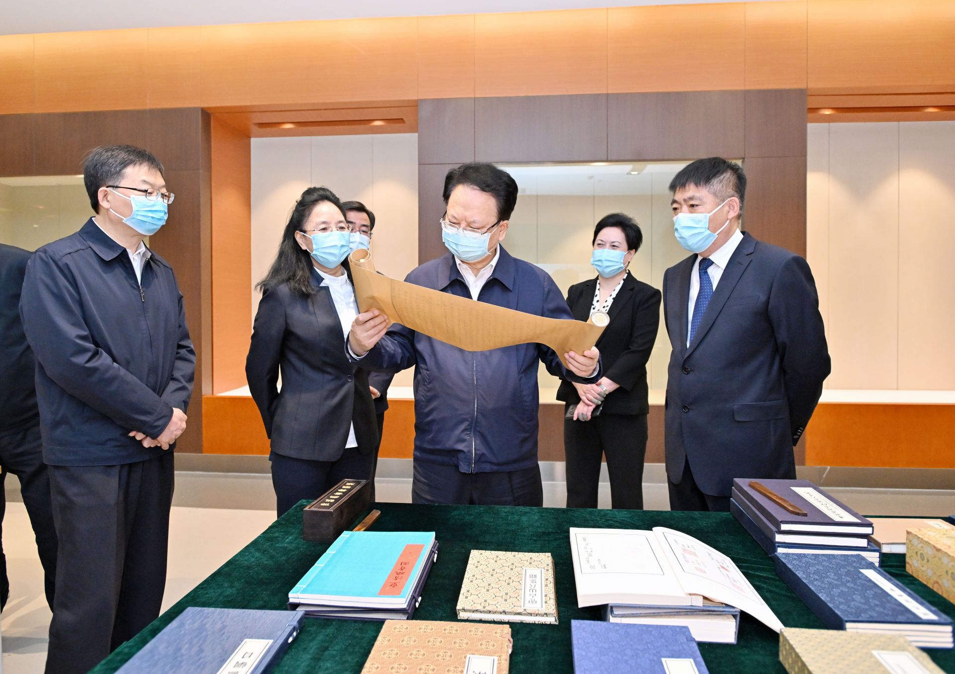 6月7日,省委书记景俊海到省图书馆调研,实地察看古籍数字加工及出版等工作。