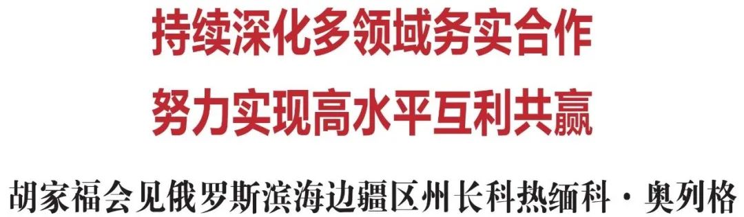 胡家福代表延边州委、州政府向科热缅科·奥列格一行到访表示欢迎。他说,中俄两国是山水相连的友好邻邦。近年来,中俄深化睦邻友好合作,两国政治互信不断深化、经贸合作成果丰硕,走出了大国邻国和睦相处、合作共赢的崭新道路。在两国元首的战略指引下,延边州与滨海边疆区持续加强互联互通、扩大友好交往、深化经贸合作,取得了丰硕成果。当前,延边州正深入贯彻习近平主席视察吉林视察延边重要讲话重要指示精神,立足区位优势和产业基础,深度融入共建“一带一路”、东北振兴、沿边开放等重大战略,在更大范围、更宽领域、更深层次推进对外开放,努力打造国内大循环的重要支点、国内国际双循环的门户枢纽。希望双方共同落实两国元首达成的重要共识,进一步加强沟通对接,建立定期会晤机制,积极搭建对接平台,持续加强彼此宣传推介,进一步扩大在汽车、能源、农产品、海产品等方面贸易合作规模,大力拓展文旅、体育、音乐等领域交往交流,努力实现互惠互利、共赢发展,共同助力中俄关系发展、造福两地人民。