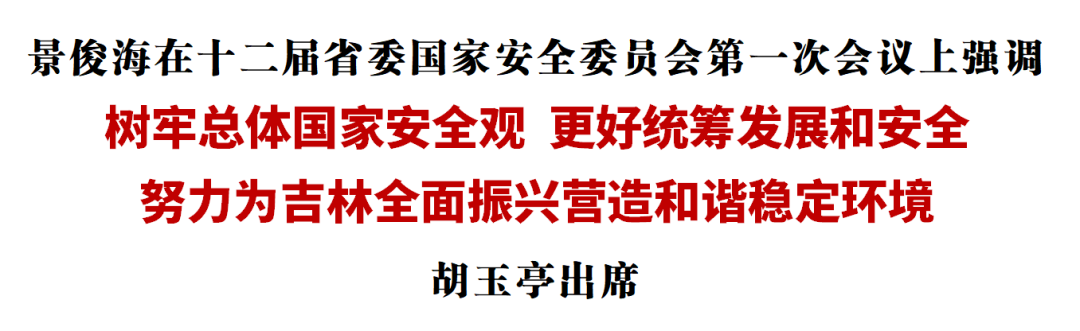 6月27日,省委书记、省委国家安全委员会主任景俊海主持召开十二届省委国家安全委员会第一次会议。他强调,要深入贯彻习近平总书记在二十届中央国家安全委员会第一次会议上的重要讲话精神,树牢总体国家安全观,更好统筹发展和安全,坚决扛稳维护国家“五大安全”重大政治责任,努力为吉林全面振兴营造和谐稳定环境。省长、省委国家安全委员会副主任胡玉亭出席会议。