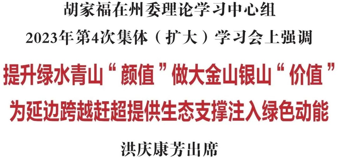 7月11日,省委常委、州委书记胡家福主持召开州委理论学习中心组2023年第4次集体(扩大)学习会。他强调,要深入贯彻习近平生态文明思想,忠实践行“两山”理念,坚决扛起维护国家生态安全重大政治责任,进一步提升绿水青山“颜值”、做大金山银山“价值”,为延边跨越赶超提供生态支撑、注入绿色动能。州委副书记、州长洪庆,州政协主席康芳出席会议。