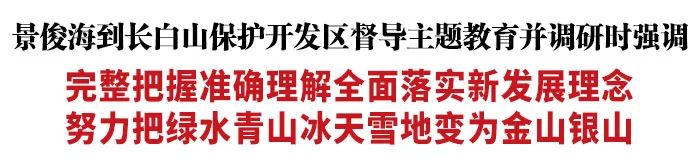7月12日,省委书记景俊海到长白山保护开发区督导主题教育并调研。他强调,要忠实践行习近平生态文明思想,坚持保护生态和发展生态旅游相得益彰,完整把握、准确理解、全面落实新发展理念,努力把绿水青山、冰天雪地变为金山银山,为建设生态强省、加快振兴发展作出新的更大贡献。