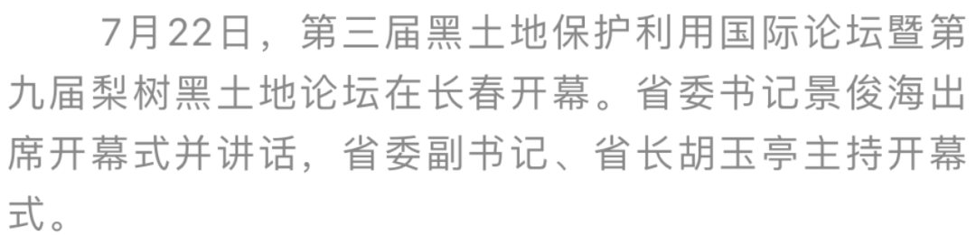 7月22日是习近平总书记视察吉林、视察梨树三周年的重要日子,又是吉林省黑土地保护日。7月22日上午,第三届黑土地保护利用国际论坛暨第九届梨树黑土地论坛在长春农博园开幕。论坛深入贯彻习近平总书记关于保护好利用好黑土地这一“耕地中的大熊猫”的重要论述,以“耕地安全与粮食产能提升”为主题,邀请国内外知名专家学者共谋黑土保护良方、共献黑土利用良策、共守黑土丰盈粮仓。省委书记景俊海出席开幕式并讲话。省委副书记、省长胡玉亭主持开幕式。