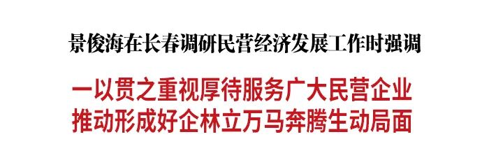 7月26日,省委书记景俊海到长春调研,贯彻落实党中央关于开展主题教育和大兴调查研究的决策部署,深入工厂车间,实地了解情况,帮助企业研究解决实际问题,促进民营经济发展壮大。景俊海强调,要深入贯彻习近平总书记关于民营经济发展的重要论述和视察吉林重要讲话重要指示精神,坚决落实《中共中央 国务院关于促进民营经济发展壮大的意见》,认真落实省委十二届三次全会部署要求,坚持“两个毫不动摇”,加快营造市场化、法治化、国际化一流营商环境,一以贯之重视、厚待、服务广大民营企业,推动形成好企林立、万马奔腾的生动局面。