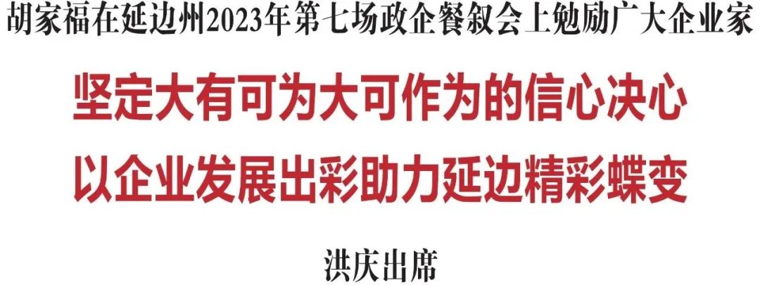 7月27日,延边州2023年第七场政企餐叙会在延吉如期举行。省委常委、州委书记胡家福出席餐叙会,勉励广大企业家坚定大有可为、大可作为的信心决心,鼓足干劲、乘势而上,放开手脚拼事业,专心致志谋发展,以企业发展出彩助力延边精彩蝶变。州委副书记、州长洪庆出席餐叙会。