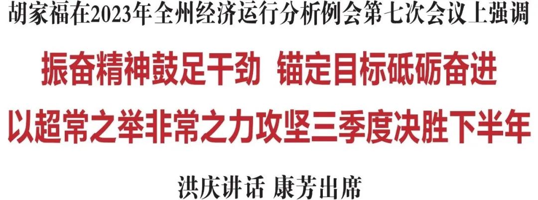 胡家福指出,今年以来,全州上下坚决贯彻习近平总书记关于稳定经济增长的重要讲话精神和省委、省政府决策部署,紧紧围绕跨越赶超的目标任务,聚力拼经济,用心谋发展,组织实施冬季施工、春节不停工不停产、春季项目集中开工、项目集中踏查、商贸促消费行动等一系列专项行动,持续激发经济发展的动力活力,主要经济指标位居全省前列,全州经济呈现稳中有进、稳中向好、稳中提质的良好态势,为完成全年目标任务提振了信心、奠定了基础。但必须清醒地看到,当前经济运行中还存在政府类投资增速下滑明显、规上工业增长承压较大、对外贸易增速出现较大回落等一些急待破解的突出问题,必须加强科学研判和跟踪监测,拿出切实可行的管用招法,为实现年度既定目标破解难题、扫清障碍。