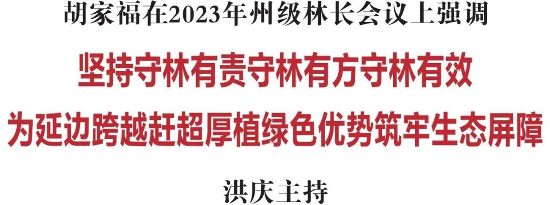 8月16日,2023年州级林长会议在延吉召开。省委常委、州委书记、州总林长胡家福出席会议并讲话。他强调,要忠实践行习近平生态文明思想和党的二十大精神,深入贯彻习近平总书记在首个全国生态日之际作出的重要指示精神,按照中央、省委关于全面推进林长制工作的部署要求,坚持守林有责、守林有方、守林有效,着力在“增绿、护绿、用绿”上下足功夫、做好文章,为延边跨越赶超厚植绿色优势、筑牢生态屏障。州委副书记、州长、州总林长洪庆主持会议。