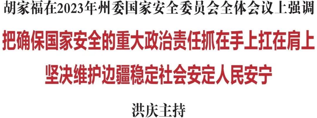 8月17日,2023年州委国家安全委员会全体会议在延吉召开。省委常委、州委书记、州委国安委主任胡家福出席会议并讲话。他强调,要深入贯彻习近平总书记在二十届中央国家安全委员会第一次会议上的重要讲话精神,按照十二届省委国家安全委员会第一次会议的部署要求,坚定不移贯彻总体国家安全观,把确保国家安全的重大政治责任抓在手上、扛在肩上,切实做到守土有责、守土负责、守土尽责,坚决维护边疆稳定、社会安定、人民安宁。州委副书记、州长、州委国安委副主任洪庆主持会议。