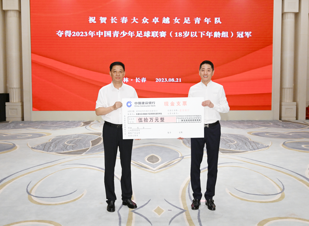 胡玉亭为长春大众卓越女足青年队颁发奖金50万元。