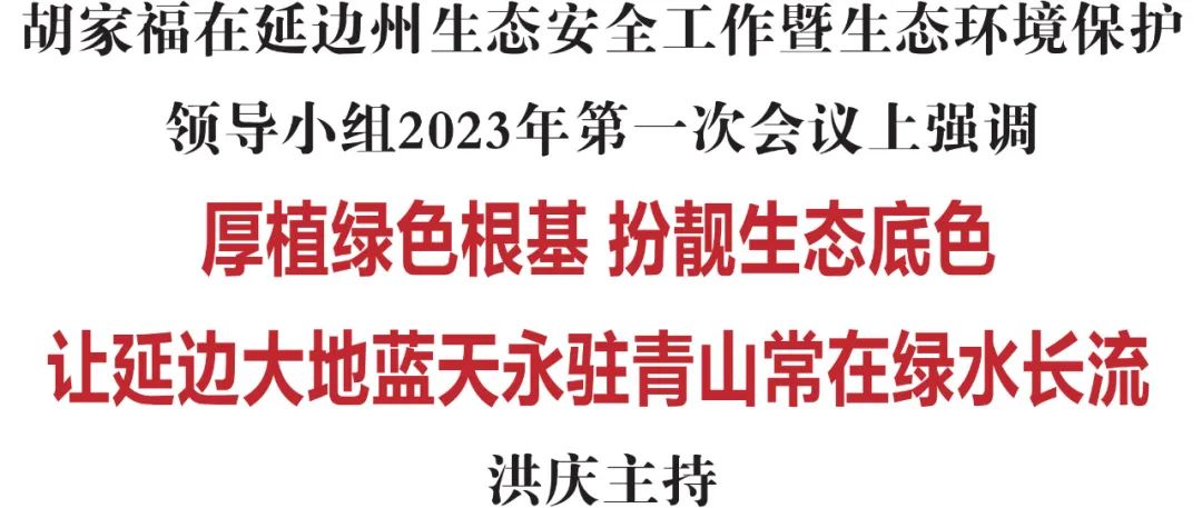 8月23日,延边州生态安全工作暨生态环境保护领导小组2023年第一次会议在延吉召开。省委常委、州委书记、州生态安全工作暨生态环境保护领导小组组长胡家福出席会议并讲话。他强调,要深入贯彻落实习近平生态文明思想和全国生态环境保护大会精神,坚决扛起维护区域生态安全的重大政治责任,厚植绿色根基,扮靓生态底色,让延边大地蓝天永驻、青山常在、绿水长流。州委副书记、州长、州生态安全工作暨生态环境保护领导小组组长洪庆主持会议。