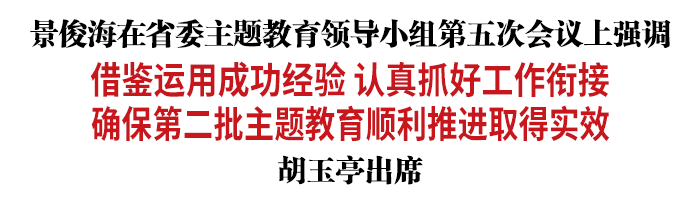 在充分肯定我省第一批主题教育取得的扎实成效后,景俊海强调,各级党委(党组)必须坚持善始善终、善作善成,以高度负责的精神把第二批主题教育科学谋划好、精心组织好。一要把握目标要求,不折不扣贯彻落实第二批主题教育指导意见,坚持好、运用好第一批主题教育有效经验、成功做法,牢牢把握学习贯彻习近平新时代中国特色社会主义思想这一主题主线和根本任务,紧紧围绕学思想、强党性、重实践、建新功的总要求,紧扣凝心铸魂筑牢根本、锤炼品格强化忠诚、实干担当促进发展、践行宗旨为民造福、廉洁奉公树立新风的具体目标,一体推进理论学习、调查研究、推动发展、检视整改、建章立制等重点措施,努力在以学铸魂、以学增智、以学正风、以学促干上取得实实在在成效。二要坚持分类施策,对县处级以上领导班子和领导干部,要参照第一批主题教育严格要求;对县处级以下党员、干部,要突出不同类型、不同领域、不同岗位的特点和实际,采取务实管用措施开展主题教育。三要突出效果导向,坚持主题教育和中心工作两手抓、两促进,大力培树“严新细实”优良作风,聚焦群众反映强烈、期待解决的急难愁盼问题,常态长效开展“我为群众办实事”实践活动,切实让人民群众从主题教育中看到新变化、得到新实惠;省直部门要与基层单位上下联动,聚焦系统解决基层问题,主动服务、完善机制、优化政策,更好地为基层排忧解难。四要强化责任落实,各级党委(党组)要把开展第二批主题教育作为重大政治任务,党委(党组)书记要切实履行第一责任人职责,各级主题教育领导小组及其办公室要精心组织实施,行业系统主管部门要发挥好指导作用,省委巡回督导组要严督实导、以导带督,共同把第二批主题教育抓出高质量、好效果。