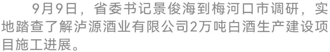 泸源酒业有限公司2万吨白酒生产建设项目是梅河口开源集团与泸州老窖集团合资项目。景俊海实地踏查施工进展,鼓励企业把传统生产工艺与吉林农特产品、道地药材结合起来,研发生产新产品,擦亮区域化、本土化品牌。梅河皓月肉牛产业综合加工项目是集肉牛养殖、加工、交易等于一体的全产业链项目,景俊海鼓励企业紧紧抓住我省推进千万头肉牛建设工程有利契机,积极发展现代生态养殖,努力建设大基地、建成大企业、发展大产业。