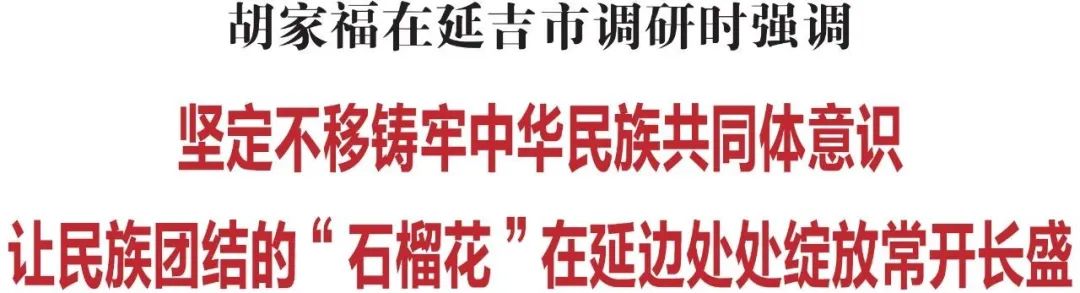 今年9月是延边第71个民族团结进步宣传月。9月12日,省委常委、州委书记胡家福来到延吉市,深入学校、社区等地就铸牢中华民族共同体意识工作开展情况进行调研,并召开座谈会。他强调,要深入贯彻习近平总书记关于加强和改进民族工作的重要思想,坚持以铸牢中华民族共同体意识为主线,不断创新民族团结进步事业的有效载体,让民族团结的“石榴花”在延边处处绽放、常开长盛。