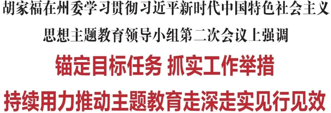 9月26日,省委常委、州委书记、州委主题教育领导小组组长胡家福主持召开州委学习贯彻习近平新时代中国特色社会主义思想主题教育领导小组第二次会议。他强调,要深入学习贯彻习近平总书记关于主题教育系列重要讲话和重要指示批示精神,锚定目标任务,抓实工作举措,持续用力推动主题教育走深走实、见行见效。