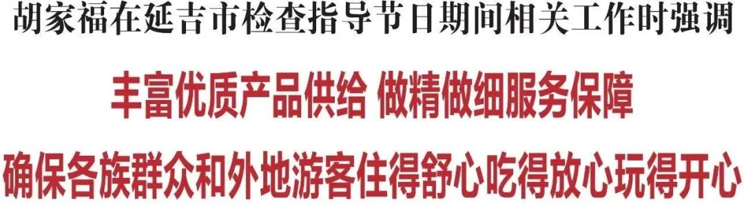 调研中,胡家福指出,今年中秋、国庆假期,我州文旅市场将迎来接待高峰,这既是扩大文旅消费、提升延边知名度、美誉度的黄金时期,也是检验城市治理水平、党员干部作风的一次集中大考。全州各级各部门要坚持底线思维、极限思维,把安全发展理念树得更牢,把各方责任压得更实,把各项防范措施抓得更紧,全力以赴做好节日期间各项工作,为各族群众平安过节营造安全稳定的社会环境。要抢抓文旅消费黄金季,进一步丰富文旅产品供给,不断提升接待服务能力,持续推出更多精品旅游线路、特色文体活动,扎实做好游客疏导、景区秩序维护等工作,让八方来客乘兴而来、满意而归。要着力加强市场供应保障,备足优质货源,保持价格稳定,及时处理回应消费者投诉,严厉打击扰乱市场秩序的违法行为,确保市场运行平稳有序。要加强应急处突准备,紧盯交通安全、设施安全、消防安全、景区安全等重点领域,推动各级执法力量下沉一线,加大安全隐患排查力度,精准有效研判辨识和防范化解重大风险,坚决防止重大安全事故发生,用党员干部的辛勤付出换得百姓的岁月静好。