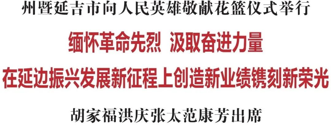 9月30日是国家设立的烈士纪念日。当天上午,州暨延吉市向人民英雄敬献花篮仪式在延边革命烈士陵园举行。省委常委、州委书记胡家福,州委副书记、州长洪庆,州人大常委会主任张太范,州政协主席康芳等领导和老战士、老同志、烈士家属、延吉市各界干部群众代表一起,向人民英雄敬献花篮,缅怀革命先烈,追忆不朽功勋,激励全州上下深入贯彻习近平总书记在新时代推动东北全面振兴座谈会上的重要讲话精神,以更加奋发有为的精神状态和只争朝夕的奋斗姿态,在延边振兴发展新征程上创造新业绩、镌刻新荣光。