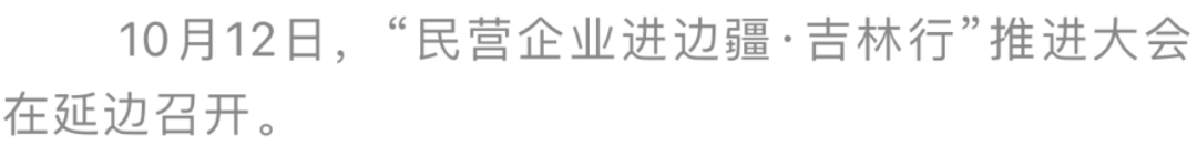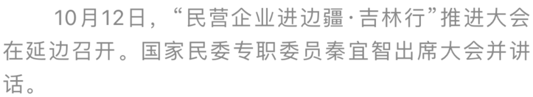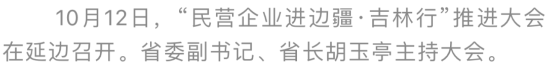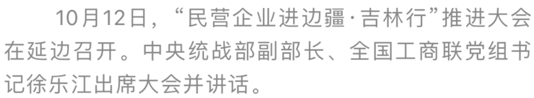10月12日,“民营企业进边疆·吉林行”推进大会在延边召开。中央统战部副部长、全国工商联党组书记徐乐江,国家民委专职委员秦宜智,省委书记景俊海出席大会并讲话。省委副书记、省长胡玉亭主持大会。大会现场签约合作项目及协议107个,签约金额255.24亿元。