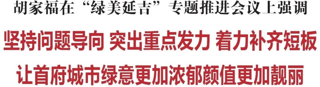 胡家福指出,去年12月以来,我们坚持把开展“绿美延吉”行动作为一项重大民生工程,以提升城市生态环境质量为引领,以绿网、路网、水网、管网项目建设为支撑,以争创国家森林城市为目标,一体推进道路绿化、景观绿化、沿河绿化,打造了一批游园广场、建设了一批精品街路、塑造了一批绿美景观、治理了一批城市“疮疤”、推出了一批网红打卡地,城市绿化、亮化、美化工作取得了明显成效,得到了社会各界和各族群众的广泛赞誉。在肯定成绩的同时,必须清醒地看到工作中仍然存在个别主街主路绿美层次不高、少数地方“脏乱差”问题依然存在、拆除违章建筑力度不够、道路交通微循环不畅、城市精细化管理水平急需提升等突出问题。延吉市及相关部门要突出问题导向、效果导向,坚持动作要快、标准要高、责任要实,抢抓秋冬两季绿化有效施工期,以项目建设为牵引,以道路畅通工程为支撑,以整合各方资源力量为保障,进一步明确目标任务、压实工作责任、细化配套举措,加快提升城市生态环境质量,丰富城市人文景观,打通城市“断头路”,开发打造新的文旅产品,推动“绿美延吉”行动再上新台阶。