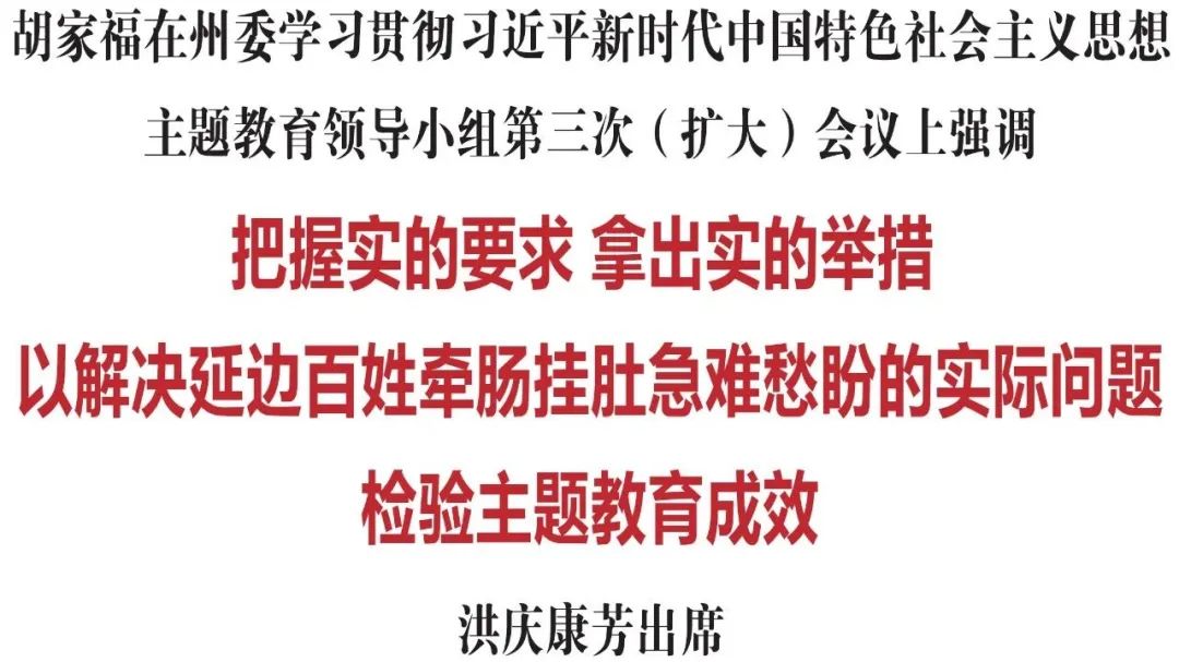 胡家福指出,第二批主题教育启动以来,各县市各部门认真贯彻落实中央和省委、州委部署要求,精心组织实施,周密安排部署,强化统筹指导,推动全州主题教育取得了阶段性成效。当前,第二批主题教育时间已将过半,各项工作正处于深入推进、全面深化的关键时期。各县市各部门要根据不同层级、不同领域、不同对象的特点,把实的要求贯穿主题教育全过程,进一步找准工作的着力点、切入点,做到边学习、边对照、边检视、边整改,推动主题教育与振兴发展相互促进、相得益彰。