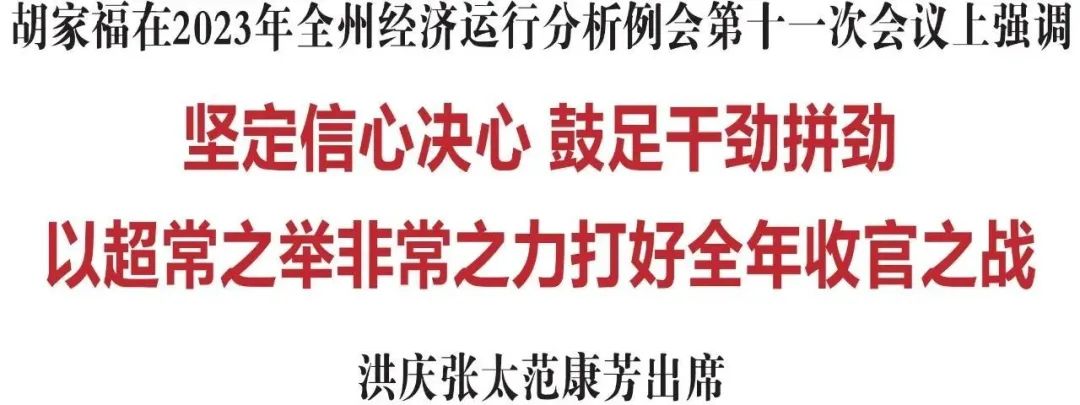 胡家福指出,今年以来,全州上下按照省委、省政府的部署要求,聚焦跨越赶超目标任务,全力以赴扩投资、稳工业、促消费、增活力,固投保持快速增长,工业运行总体平稳,消费市场持续升温,经济运行延续前三季度稳定增长的良好态势。在肯定成绩的同时,必须清醒地看到,当前经济运行中还存在固定资产投资后劲不足、工业增长持续承压、限上社消回落明显等问题,必须强化问题导向,突出精准施策,以更加有力有效的举措推动经济持续保持稳中向好、稳中有进、稳中提质的良好势头。