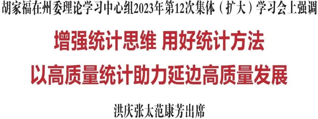 12月12日,州委理论学习中心组2023年第12次集体(扩大)学习会在延吉召开。省委常委、州委书记胡家福主持会议并讲话。他强调,要深入贯彻习近平总书记关于统计工作重要讲话重要指示精神,进一步深化对统计工作规律性认识,增强统计思维,用好统计方法,以高质量统计助力延边高质量发展。州委副书记、州长洪庆,州人大常委会主任张太范,州政协主席康芳出席会议。