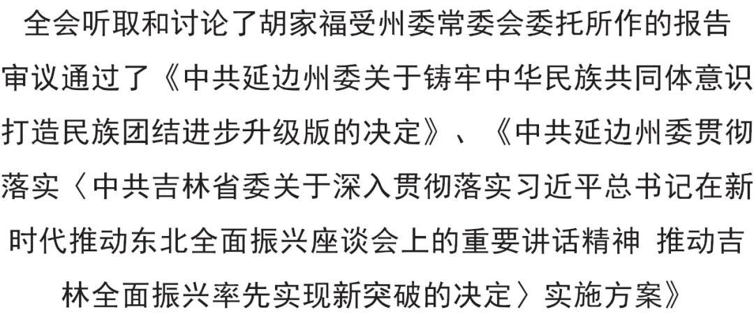 全会坚持以习近平新时代中国特色社会主义思想为指导,全面贯彻落实党的二十大精神,听取和讨论了胡家福受州委常委会委托所作的工作报告,审议通过了《中共延边州委关于铸牢中华民族共同体意识 打造民族团结进步升级版的决定》、《中共延边州委贯彻落实〈中共吉林省委关于深入贯彻落实习近平总书记在新时代推动东北全面振兴座谈会上的重要讲话精神 推动吉林全面振兴率先实现新突破的决定〉实施方案》。胡家福就《决定(讨论稿)》向全会作了说明。