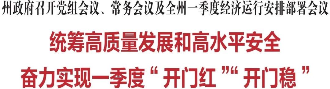 1月22日,州委副书记、州长洪庆主持召开2024年第2次党组会议、十六届州人民政府第28次常务会议及全州一季度经济运行安排部署会议,传达学习贯彻习近平总书记在中央纪委三次全会上的重要讲话精神及州委部署要求,习近平总书记重要文章《完整、准确、全面贯彻落实关于做好新时代党的统一战线工作的重要思想》,习近平总书记在省部级主要领导干部推动金融高质量发展专题研讨班开班式上的重要讲话精神及州委部署要求;审议《一季度全州经济运行“开门红”工作方案》;听取一季度全州经济运行工作建议,州直有关部门一季度经济指标预测情况及工作措施,关于做好近期安全生产工作情况汇报,并决定分别按照程序报告。