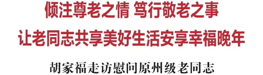 走访慰问中,胡家福与老同志促膝谈心、亲切交流,关切询问他们的身体健康和生活起居等情况,为他们送去新春祝福。胡家福说,老同志是党和国家的宝贵财富,是延边经济社会发展的亲历者、参与者和见证者,为延边各项事业发展付出了艰辛努力、作出了重要贡献。尊敬老同志,就是尊重延边光荣的历史;关爱老同志,就是珍视延边宝贵的财富。全州各级各部门要深入贯彻习近平总书记关于老干部工作的重要指示精神,满腔热忱关怀关爱老同志,精心细致做好各项服务保障,用心用情办实事、做好事、解难事,让老同志们健康愉快地安度晚年、颐养天年、益寿延年。
