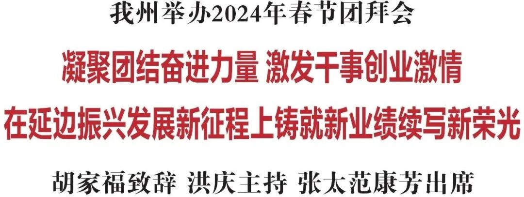 新春佳节即将到来之际,2月7日,州委、州政府在延吉举办2024年春节团拜会。省委常委、州委书记胡家福出席并致辞,州委副书记、州长洪庆主持,州人大常委会主任张太范、州政协主席康芳出席。