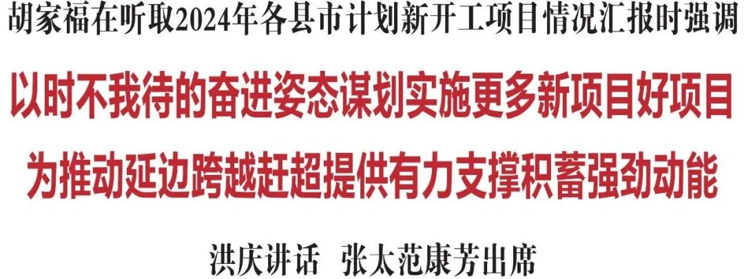 胡家福指出,2024年是中华人民共和国成立75周年,是实现“十四五”规划目标任务、加快推动延边跨越赶超的关键一年,做好今年经济工作意义重大。项目建设是稳定经济增长的“压舱石”、推动高质量发展的“强引擎”,今天的项目就是明天的产业、今天的投资就是未来的效益,没有项目就没有未来。各县市要牢牢把握推动高质量发展这个主题,切实增强抓好项目建设的政治责任感和工作紧迫感,紧盯项目谋划、要素保障、推进落地三个关键环节,努力以项目建设之“进”支撑全州经济发展之“稳”。要千方百计推进项目前期,坚持“能早则早、能快则快”的原则,进一步强化效率意识,持续加大工作力度,紧锣密鼓地推进立项、环评等项目手续办理,抓实抓细各个环节和关键节点,切实提高项目的成熟度,确保项目能落地、可实施。要持之以恒做好要素保障,坚持“要素跟着项目走、服务围着项目转”,强化用能、用工等要素保障,以创新思维、精准举措着力破解项目建设中的难点堵点问题,使重大项目顺利动起来、迅速干起来。要坚持不懈抓好项目招引,牢固树立“制造业当家”理念,树立和用好整体资源观,灵活运用各种招商方式,积极对接目标企业,紧跟企业投资动向,以真心诚意感动企业,用优质服务吸引客商,招引一批关联度高、互补性强的产业项目,进一步完善产业链条、健全产业体系,着力提升产业竞争力、塑造发展新优势。