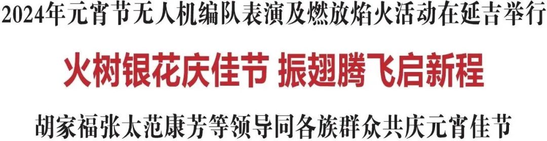 流光溢彩添锦绣,多彩焰火耀延边。2月24日是农历正月十五,当天夜晚,以“铸牢中华民族共同体意识 谱写延边民族团结新篇章”为主题的2024年元宵节无人机编队表演及燃放焰火活动在延吉市震撼上演。省委常委、州委书记胡家福,州人大常委会主任张太范,州政协主席康芳等领导,同全州各族群众和广大游客共赏精彩表演、共庆元宵佳节。