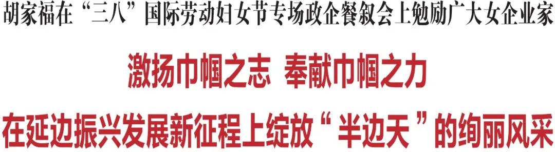 3月7日,在“三八”国际劳动妇女节即将到来之际,我州举行专场政企餐叙会,邀请州内各行各业的女企业家代表齐聚一堂、欢度佳节、共叙发展。省委常委、州委书记胡家福出席餐叙会,代表州委、州政府向奋战在全州各条战线上的广大妇女同胞致以节日祝贺和美好祝福,勉励全州广大女企业家要振奋精神、鼓足干劲,激扬巾帼之志、奉献巾帼之力,在延边振兴发展新征程上绽放“半边天”的绚丽风采。