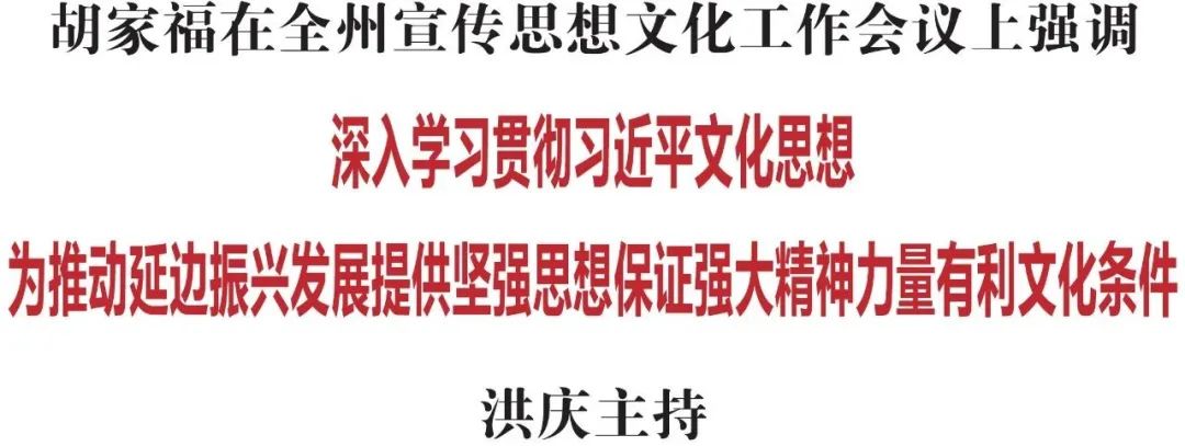 3月22日,全州宣传思想文化工作会议在延吉召开。省委常委、州委书记胡家福出席会议并讲话。他强调,要深入学习贯彻习近平文化思想,按照全国、全省宣传思想文化工作会议部署要求,坚持以铸牢中华民族共同体意识为主线,坚定不移举旗帜、聚民心、育新人、兴文化、展形象,为推动延边振兴发展提供坚强思想保证、强大精神力量、有利文化条件。州委副书记、州长洪庆主持会议。