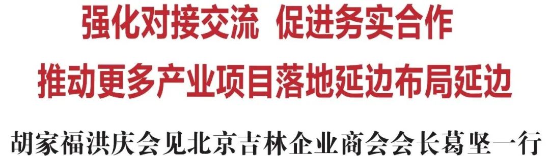 胡家福代表州委、州政府对葛坚一行表示欢迎。他说,北京吉林企业商会长期以来心系延边振兴发展、倾力支持延边各项事业,充分发挥人才荟萃、资源富集优势,积极引导商会会员企业来延交流考察、投资开发,在招商引资、扶贫助困、宣传推介等方面发挥了重要作用,为加快推动延边跨越赶超作出了积极贡献。当前,我州正在深入贯彻习近平总书记在新时代推动东北全面振兴座谈会上的重要讲话精神,认真落实省委、省政府“一主六双”高质量发展战略,集中精力打造“十大产业集群”,加快培育发展新质生产力,积极构建多点支撑、多业并举、多元发展的现代化产业体系,努力抢占新赛道、塑造新动能、构筑新优势。希望北京吉林企业商会一如既往地关心和支持延边,充分发挥桥梁纽带作用,推动更多资本、技术、项目等落地延边、汇聚延边,在文化旅游、医美康养、现代农业等领域开展务实合作,和延边一道共享新机遇、共谋新发展、共创新未来。延边州委、州政府将认真落实招商引资各项优惠政策,着力提供优质高效的服务保障,为企业在延投资发展创造良好条件,努力实现双方互惠互利、共赢发展。
