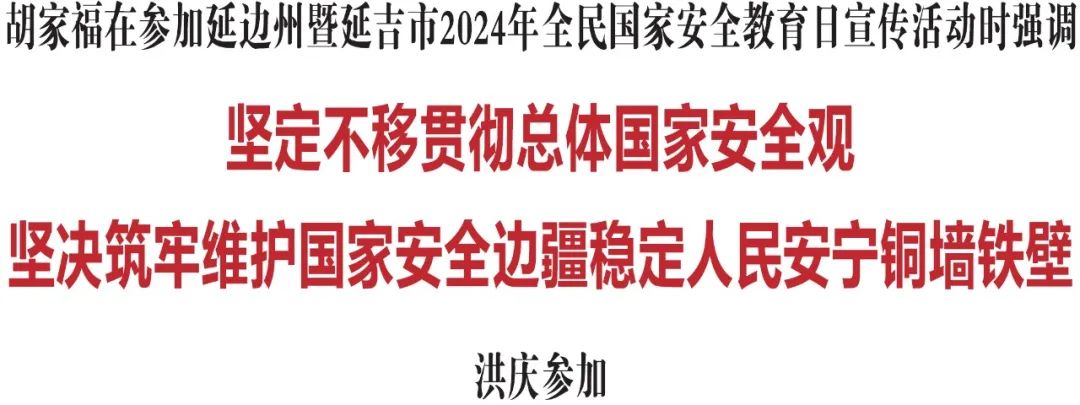 4月15日是第九个全民国家安全教育日。当天下午,延边州暨延吉市2024年全民国家安全教育日宣传活动在延吉市青年广场举行。省委常委、州委书记、州委国家安全委员会主任胡家福在参加活动时强调,要深入贯彻习近平总书记关于总体国家安全观的重要论述,坚定不移贯彻总体国家安全观,全力以赴做好国家安全工作,着力加强国家安全宣传教育,坚决筑牢维护国家安全、边疆稳定、人民安宁的铜墙铁壁。州委副书记、州长、州委国家安全委员会副主任洪庆参加活动。