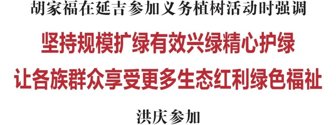 春风吐绿、草木初萌,又到植树好时节。4月17日,省委常委、州委书记胡家福,州委副书记、州长洪庆等领导来到延吉市文冠园,与干部群众一同参加义务植树活动,以实际行动为延边大地再添新绿。胡家福强调,要深入贯彻习近平生态文明思想和习近平总书记在参加首都义务植树活动时的重要讲话精神,牢固树立“增绿就是增优势,植树就是植未来”的理念,坚持规模扩绿、有效兴绿、精心护绿,不断增厚延边振兴发展的“绿色家底”,让各族群众享受更多生态红利、绿色福祉。