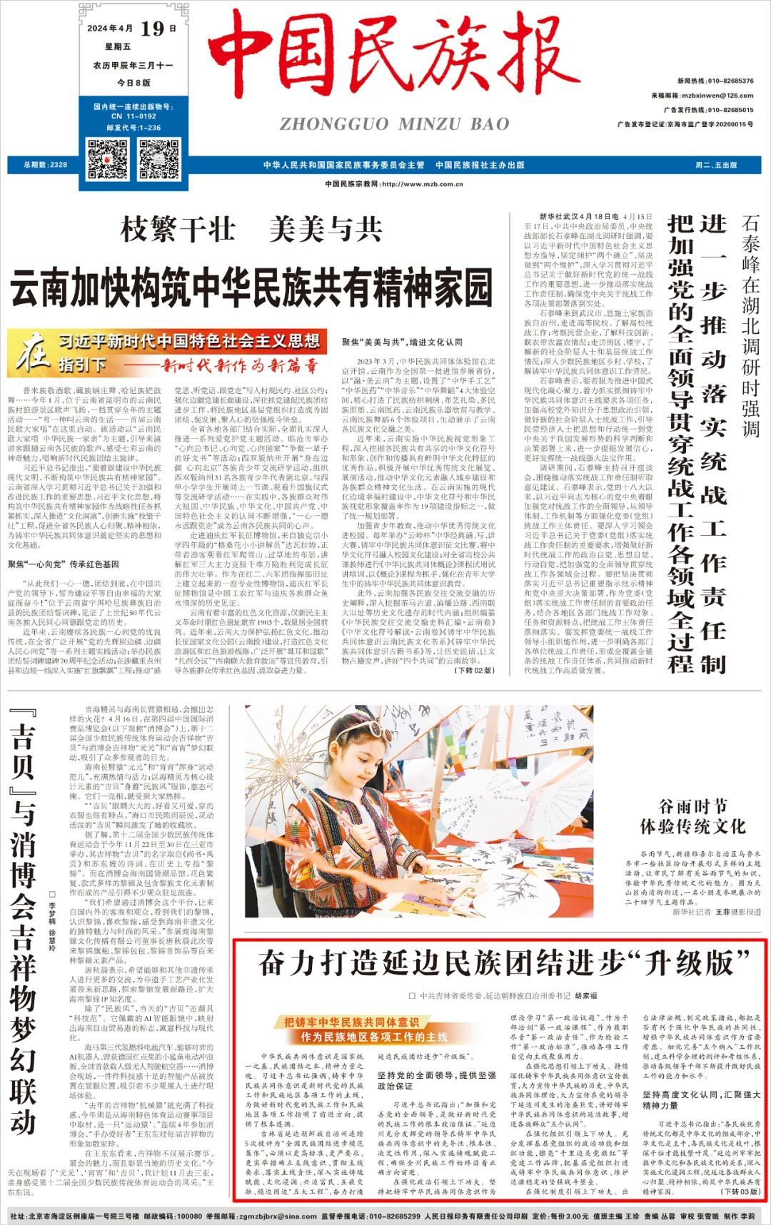 4月19日,中国民族报头版刊发中共吉林省委常委、延边朝鲜族自治州委书记胡家福署名文章《奋力打造延边民族团结进步“升级版”》。