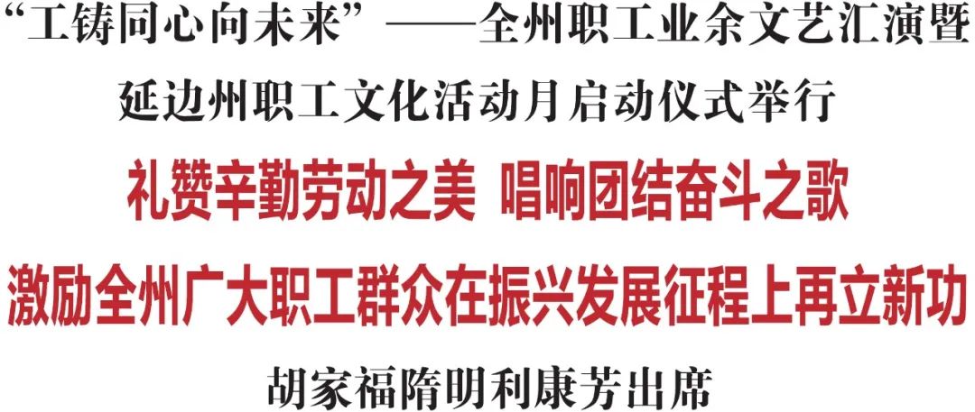 5月7日,“工铸同心向未来”——全州职工业余文艺汇演暨延边州职工文化活动月启动仪式在延边工人文化艺术中心举行。省委常委、州委书记胡家福,省总工会党组书记、常务副主席隋明利,州政协主席康芳出席仪式。州委常委、宣传部部长金基德在仪式中致辞。州人大常委会副主任、州总工会主席王秋菊主持仪式。