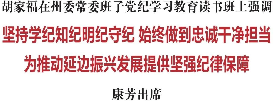 5月13日,省委常委、州委书记胡家福主持召开州委常委班子党纪学习教育读书班,集中学习《中国共产党纪律处分条例》。胡家福强调,要深入贯彻习近平总书记关于党纪学习教育的重要讲话重要指示精神,认真学习领会《中国共产党纪律处分条例》,坚持学纪知纪明纪守纪,始终做到忠诚干净担当,为推动延边振兴发展提供坚强纪律保障。州政协主席康芳出席。