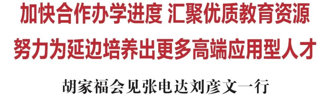 胡家福代表州委、州政府对张电达、刘彦文一行表示欢迎。他说,东华教育集团和河北东方学院拥有雄厚的办学经验和资源优势,是吉林和河北两省规模最大、最具影响力的民办教育机构之一,为地方经济社会发展输送了大量实用型、复合型人才,赢得了社会各界的普遍赞誉。多年来,延边州委、州政府坚持把教育工作摆在优先发展位置,把教育事业作为重大民生工程来抓,持续推进各级各类教育均衡发展,特别是高等教育走在全国少数民族自治州前列。当前,我州正在深入贯彻习近平总书记在新时代推动东北全面振兴座谈会上的重要讲话精神,加快建设高质量教育体系,着力完善边疆民族地区职业教育,努力打造高素质人才培养高地。希望东华教育集团和河北东方学院充分发挥各自优势,创新理念、整合资源,不断深化在高等教育领域的务实合作,加快延边应用技术学院、吉林萨哈理工大学建设步伐,推动全州高等教育事业迈上新台阶,努力为延边培养出更多高端应用型人才。州市两级党委、政府将拿出最大诚意、最优惠政策、最有力措施全力支持项目建设,全心全意提供优质高效服务保障,助力学校做大做优做强,努力实现互利共赢。