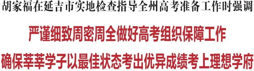 一年一度的高考即将拉开帷幕。6月5日,省委常委、州委书记胡家福到延吉市实地检查指导全州高考准备工作。他强调,要深入贯彻习近平总书记重要指示精神,按照党中央和国务院部署要求,以极端负责、精益求精的态度,严谨细致、周密周全做好高考组织保障工作,确保莘莘学子以最佳状态考出优异成绩、考上理想学府。
