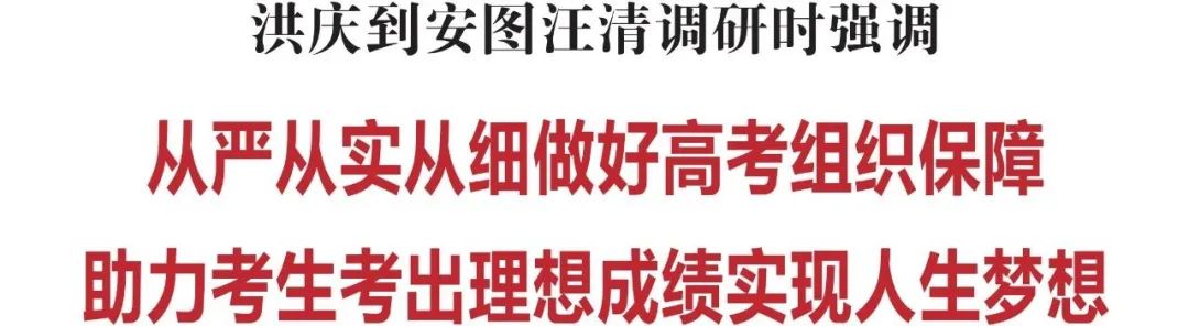 洪庆首先来到安图县王德泰红军小学,详细了解了全县高考准备工作,踏查考试环境。他指出,高考关乎国家选才育才、关乎社会公平正义、关乎千家万户的期待与幸福,容不得有半点闪失,不允许有任何懈怠。各级各相关部门要统一思想、提高政治站位,精心组织、周密安排,高标准、严要求做好各项工作,全力保障高考安全平稳顺利。严肃考场纪律,加强考生和考务工作人员诚信教育,坚持人防物防技防并举,强化安全管控,紧盯试卷流转、入场安检等重点环节,细致有效做好组考、防作弊、考试环境治理等工作,切实维护高考公平公正。