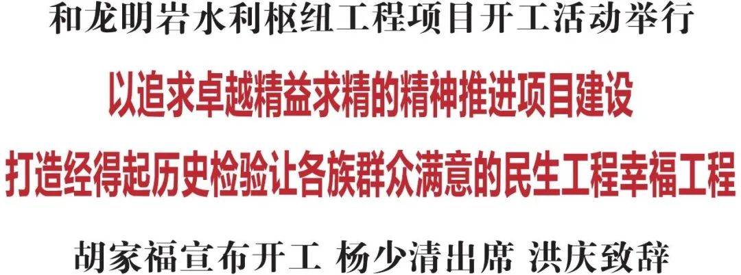 6月18日,和龙明岩水利枢纽工程项目开工活动在和龙市举行,标志着全州各族群众密切关注、期盼已久的这一重大民生工程正式拉开建设序幕。省委常委、州委书记胡家福出席活动并宣布项目开工。省水利厅厅长杨少清出席活动。州委副书记、州长洪庆出席活动并致辞。
